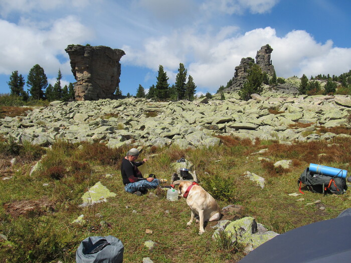 Ходили с другом и собакой с целью прогуляться и побатониться в отпуске.