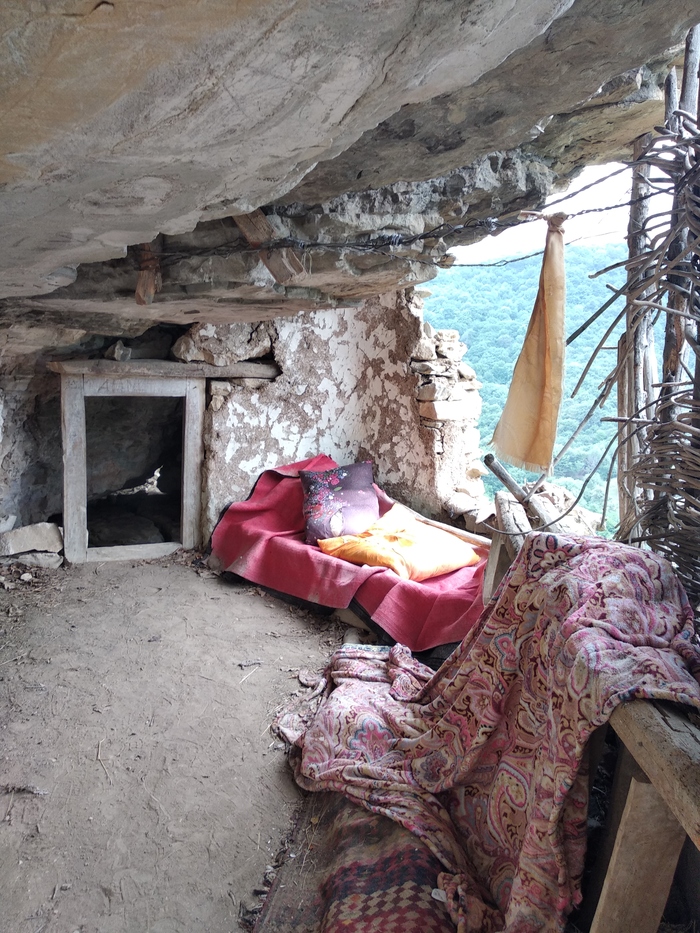 Вход в нее находится на отвесном склоне узкого горного хребта, нависающий над рекой. На высоте около 400 м в нем находится дверь, к которой ведут каменные ступени. Открыв ее и спустившись по шаткой деревянной лестнице внутрь, вы попадаете в высокий (почти 8 м) зал шириной 4,5 м. Под ним расположено еще одно помещение, поменьше. На полу — множество дорогих ковров разной степени ветхости, их оставляют в дар пещере. Стены — сухие и гладкие, встречаются летучие мыши. Говорят что она состоит из семи залов, два из них доступны, остальные завалили.