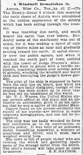 17 апреля 1897 года газета сообщила, что двумя днями ранее НЛО столкнулось с ветряной мельницей на ранчо судьи Дж. С. Проктора и в результате рухнуло на землю. Пилот не выжил в катастрофе и был найден мертвым среди обломков своего корабля. После осмотра землевладельцем, офицером армейской службы связи и, предположительно, половиной населения Авроры, пилот был признан «не от мира сего» и даже «марсианином», если верить офицеру связи.