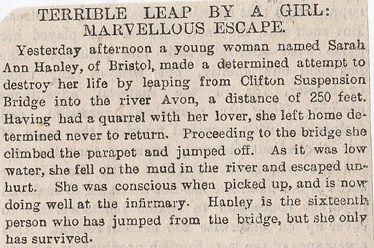 «Вчера, чуть позже полудня, Сара Энн Хенли, проживающая по адресу Твиннелл-роуд, 48, Сент-Филлипс, спрыгнула с подвесного моста и, что характерно, когда ее подняли из грязи внизу, она пришла в сознание и вскоре смогла назвать свое имя и адрес. Человеком, которому удалось так чудесно спастись, была молодая женщина 22 лет, проживающая по вышеуказанному адресу со своим отцом, уважаемым рабочим. Она некоторое время общалась с молодым человеком, но недавно поссорилась с ним, и за «несколькими словами» между ними ночью или две назад последовало расставание и письмо, в котором он отказался от компании. Письмо было получено в четверг и было воспринято Хенли очень близко к сердцу, соседи заметили, что она выглядит подавленной. Вчера утром ее видели на Твиннелл-стрит около 11 часов, и тогда же заметили ее подавленность. В четверть первого она спрыгнула с моста. Женщина упала, как будто она собиралась нырнуть в реку, которая текла вниз. Прилив был чрезвычайно низким. Мягкие илистые берега, соответственно, не были полностью покрыты водой. Дул довольно сильный ветер, и платье женщины оказало ему большое сопротивление, не только существенно замедлило скорость ее падения, но вместо того, чтобы упасть вертикально, ее вынесло на берег Глостера, где она упала в грязь. Грязь легко поддалась, и женщина, выпрямившись во весь рост, погрузилась в нее на небольшую глубину. Была подана тревога, и Джон Уильямс из Эштон-Гейт и Джордж Дрю принялись вытаскивать ее из грязи на дорогу. Послали за Бренди, и, не сумев найти попутное такси, отправили посыльного в полицейский участок Клифтона за носилками. Несколько констеблей отнесли ее на носилках в учреждение, где после осмотра хирургами в приемном покое ее поместили в одну из палат. Она не считалась находящейся в непосредственной опасности.