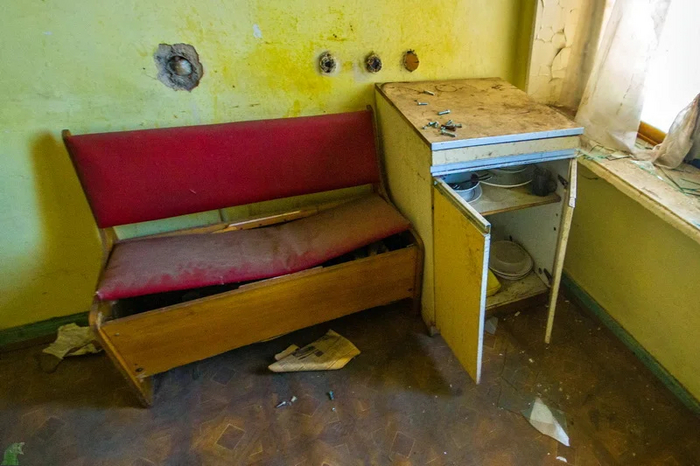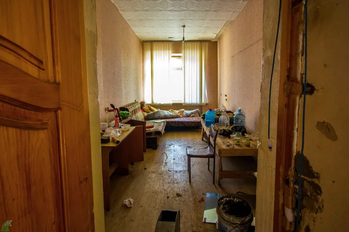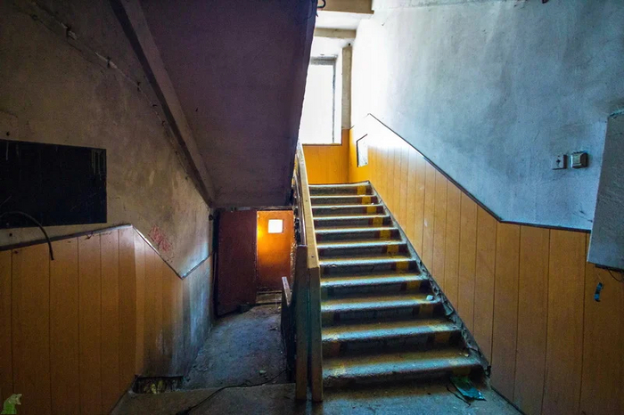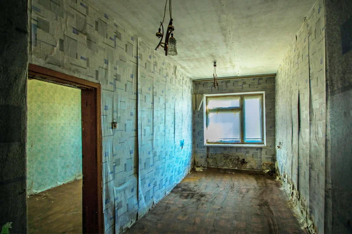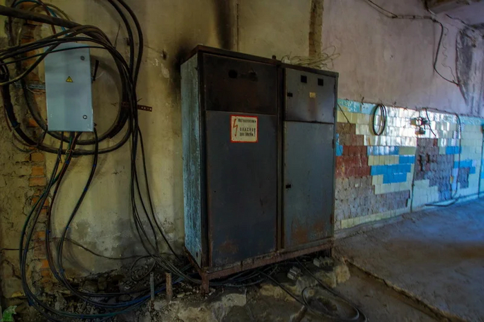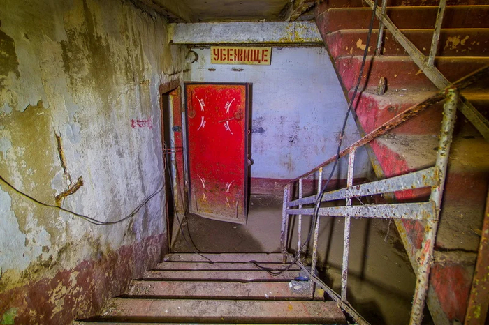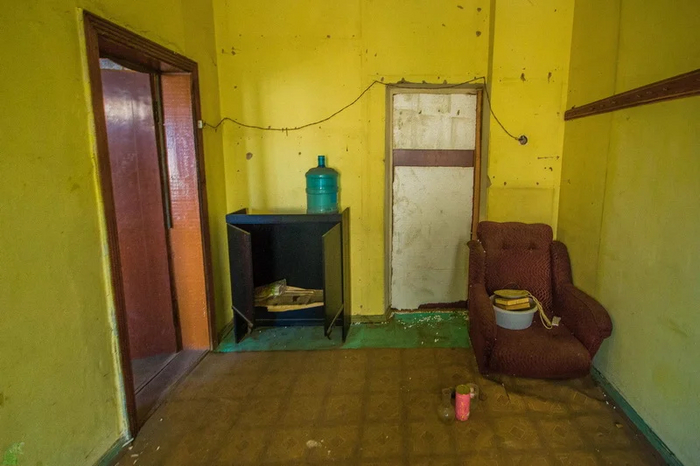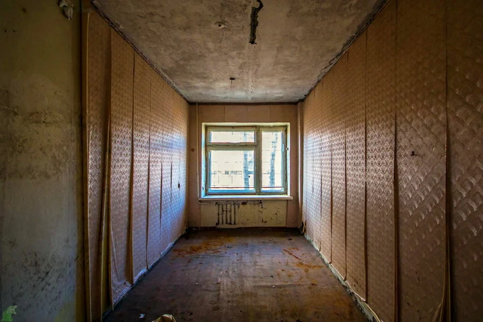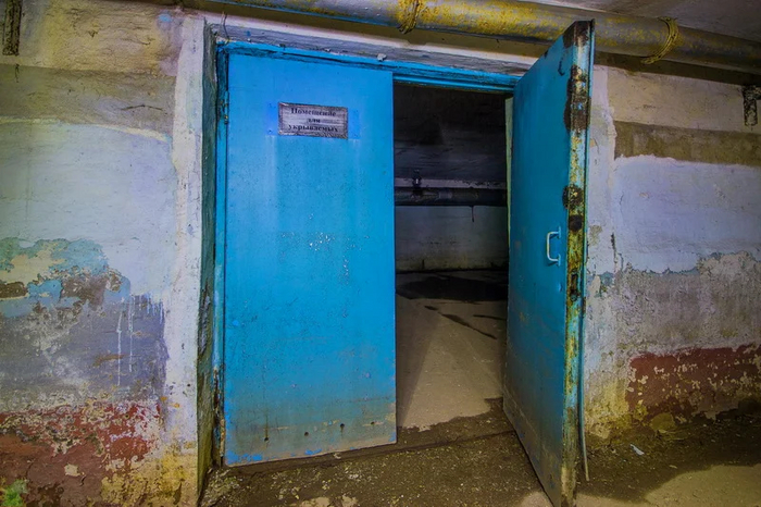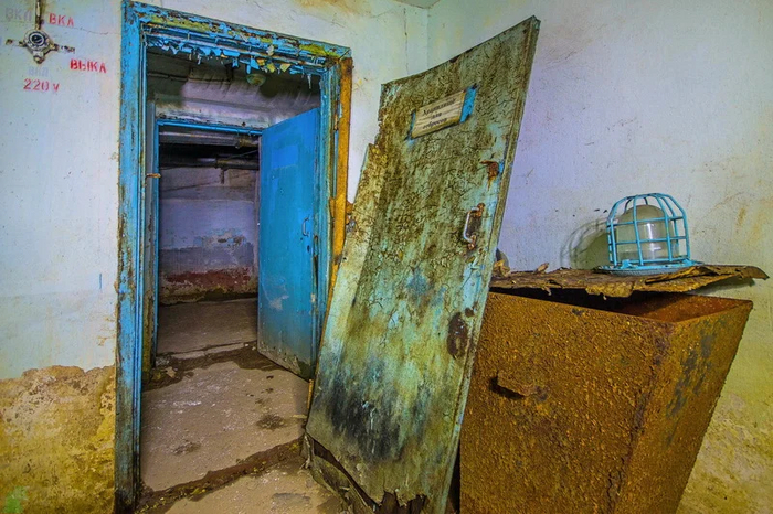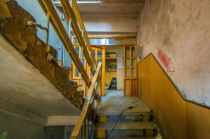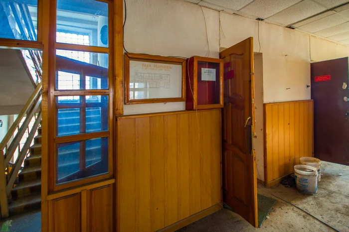 Помещение с окошком и предупреждающими плохо читабельными табличками.