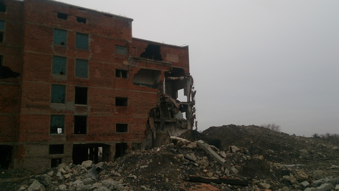 Здание пытались обрушить. Отбойным молотком разбили несущие колонны. Но, почему-то так и оставили его скелет стоять посреди изрытой гусеницами пустыни. Сейчас оно напоминало изъеденное тленом тело какого-то индуистского божества.