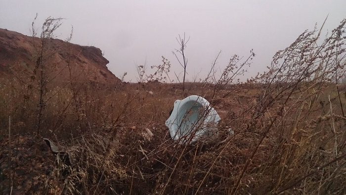 Внимание привлек блик, слева от моего пути. Я решил подойти ближе. Кажется, меньше всего я ожидал увидеть пробитый насквозь голубой унитаз. Что он делал в этих краях?