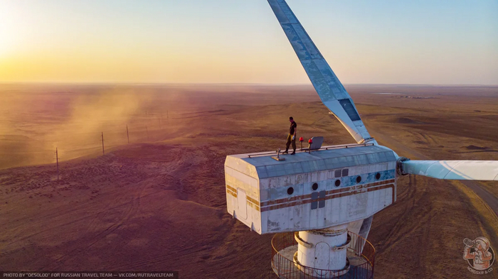 В двадцати километрах от Элисты, столицы Республики Калмыкия, возле трассы стоит заброшенный ветрогенератор. Башен там три, но на одной установлены антенны сотовых операторов, а от второй осталось только основание, меня заинтересовала третья башня — с виду вполне целая.