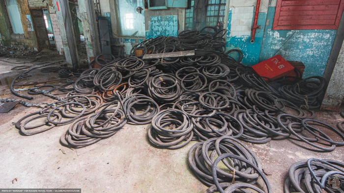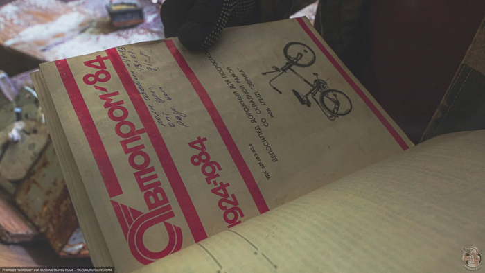 Но о том, что завод занимался выпуском велосипедов можно понять даже по этим руинам. По административному корпусу раскиданы чертежи, технические карты и каталоги продукции, а на производственных цехах то и дело попадаются детали на от велосипедов: шины, рамка, педали…