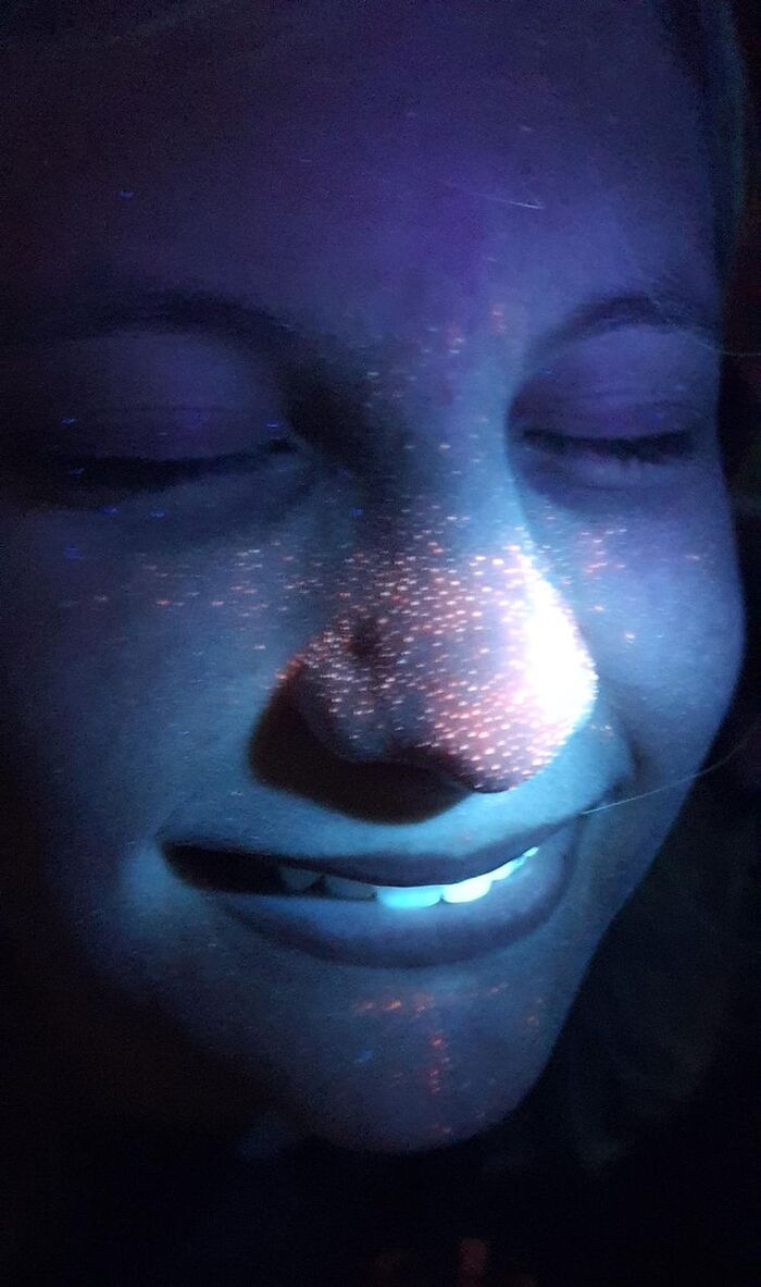 Моя дочь хотела увидеть свои зубы под ультрафиолетом. Сюрпризом стали черные точки на ее носу, которые светились оранжевым цветом»
