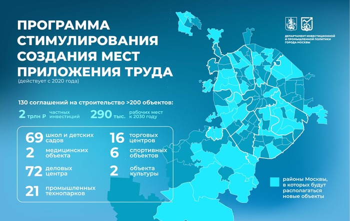 К настоящему моменту заключено свыше 130 соглашений на строительство более 200 объектов. В результате в городе появится свыше 290 тыс. рабочих мест. В рамках программы город уже получил 23 объекта, на которых создано 21 тыс. рабочих мест. А в следующем году работы завершат на 42 объектах, что даст городу еще 36 тыс. рабочих мест.