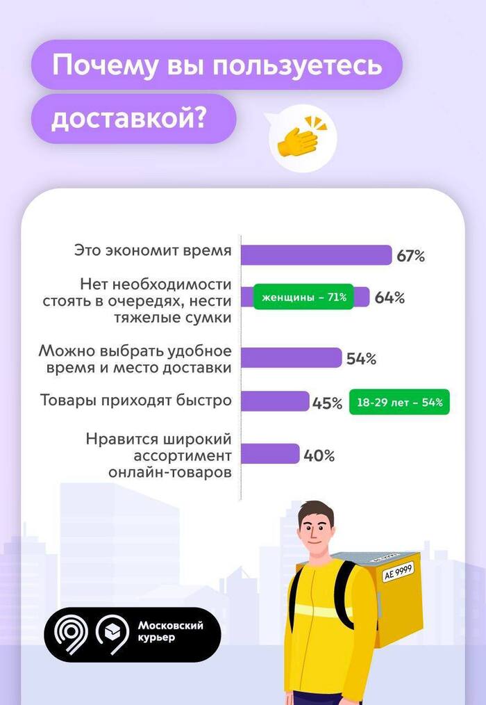 Опрос провел инновационный центр «Безопасный транспорт». Исследование показало, что москвичи ценят доставку за экономию времени, отсутствие очередей и возможность выбрать удобное время и место получения заказа.
