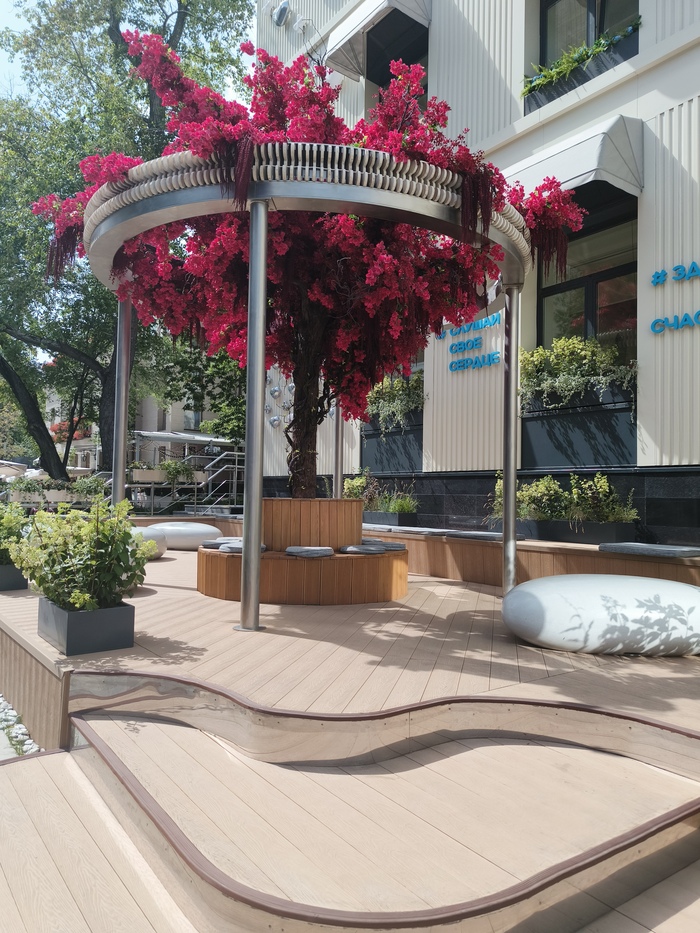 Большой ресторан на Новом Арбате, по которому впервые за всё время кайфово пройти. Сделали выдающиеся инсталяции к лету. Сразу скажу, в «Чуде» делают кальяны. Я их не застал, был днём, но даже в +35 было очень принятно находиться из-за свежего ветерка, который тут по Арбату ходит.