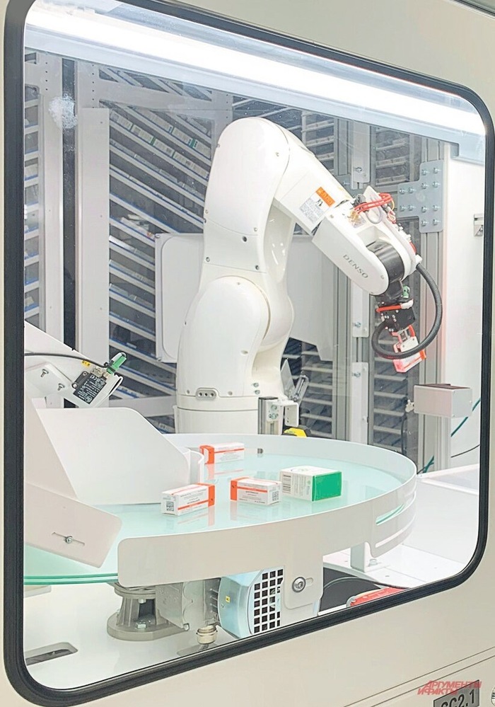 В 2024 году такой появился в больнице № 67 им. Ворохобова. Сотрудникам нужно только загрузить препараты на единую трековую линию, а робот сканирует штрихкоды на упаковках, проверяет сроки годности и соответствие товарным накладным. Затем распределяет лекарства на полках хранилища и ведет их учет. Получив заказ, робот собирает лекарства и упаковывает их в контейнеры, которые затем забирают сотрудники отделений.