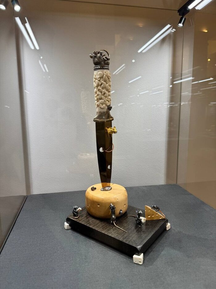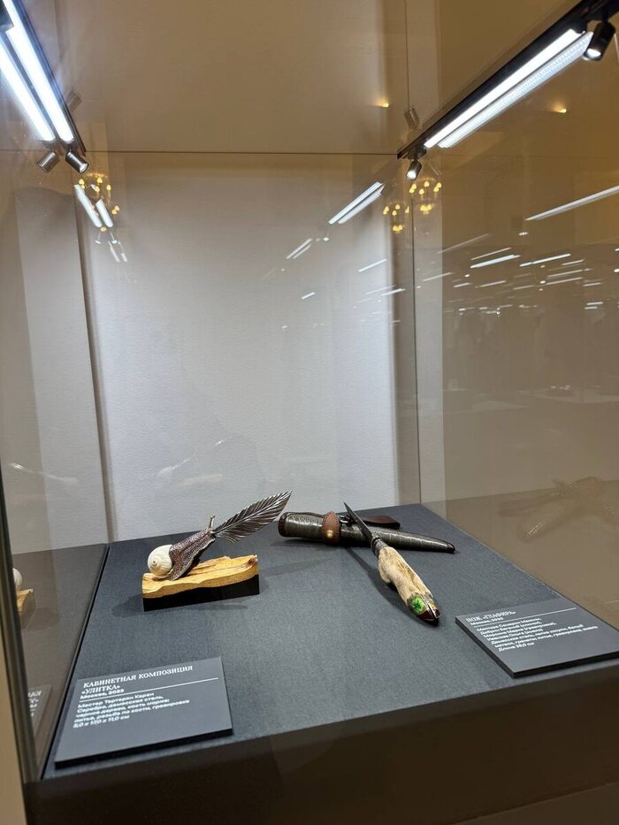 Кроме того, на выставке можно увидеть холодное оружие, выполненное методами тончайшей ручной гравировки, выпиловки и чеканки с использованием янтаря, кости и дерева.