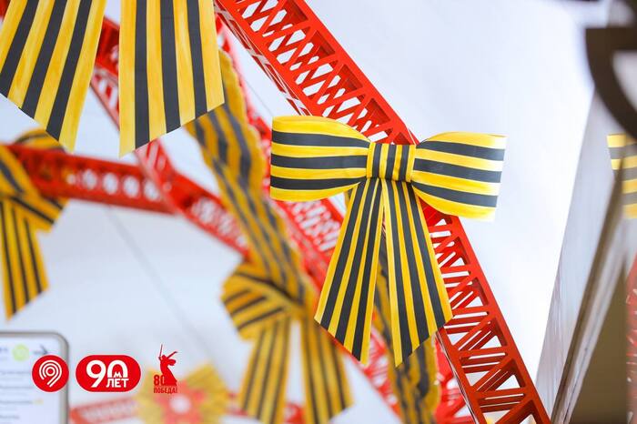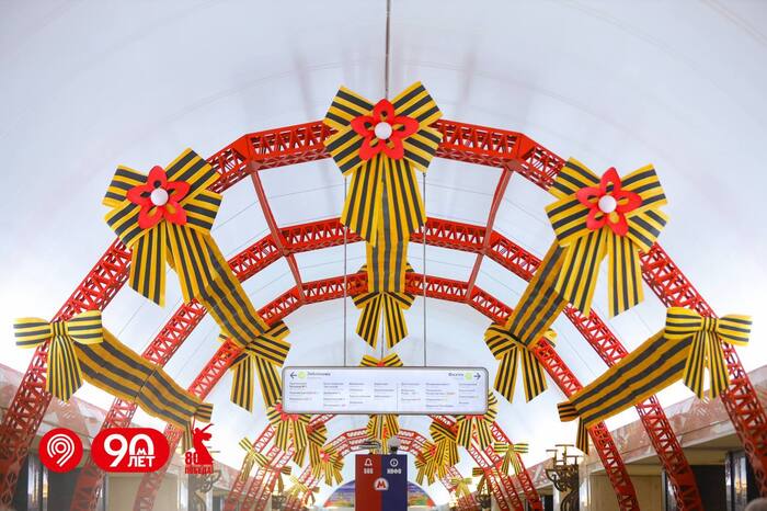 Также украсили потолочный свод на станции «Трубная» к 9 Мая. Здесь разместили 25 Георгиевских лент и 50 бантов.