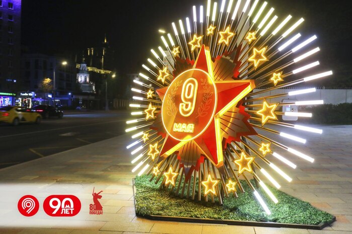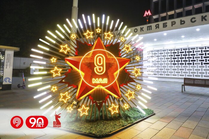 Разместили украшения к 80-летию Победы перед выходами 11 станций метро. У 10 станций установили инсталляции со звездами и светящимися лучами.