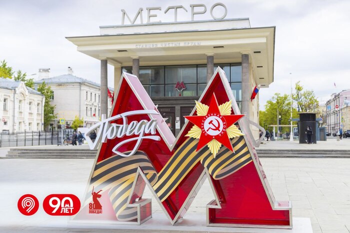 У станции метро «Чистые пруды» мы установили инсталляцию в виде буквы «М» высотой в 2 м с георгиевской лентой, орденом и надписью «Победа» в ретростиле.