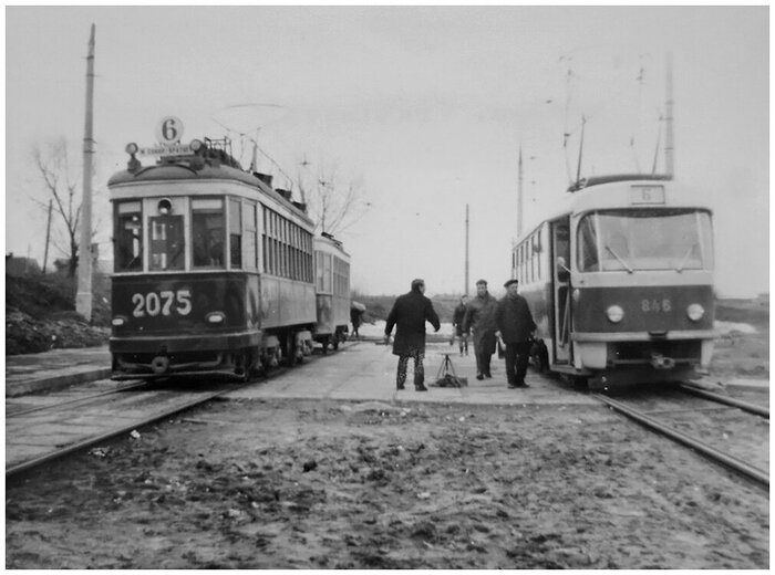 Трамвайное кольцо "Улица Героев-Панфиловцев" и два поколения трамваев. Справа - новенькая Татра Т3, а слева - старый добрый вагон КМ (Коломенский машиностроительный).