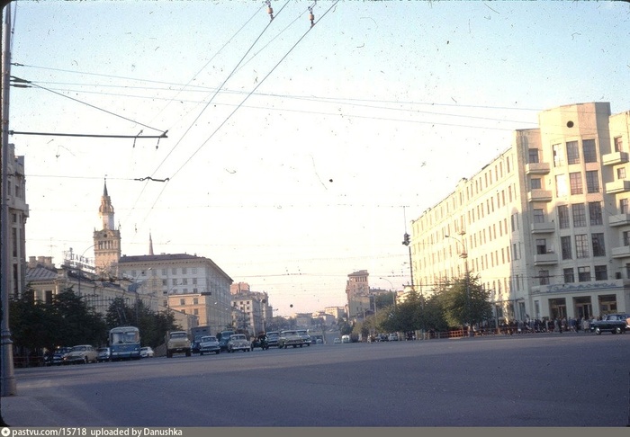 Это фото сделано на Садовом в сквере у площади Восстания, ныне Кудринской, рядом с высоткой. На заднем плане Баррикадная улица. Город украшен к празднованию Первомая. Фото 1961 года, Херб Гулдон