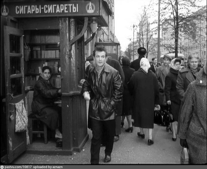 Москвичи и гости столицы на Садовом кольце рядом с улицей Чернышевского, ныне Покровкой. Это вид в сторону Красных ворот. В те годы на улицах города ещё было много различных киосков сооруженных из дерева, в семидесятых их уже заменили на металлические. Это кадр из фильма "Застава Ильича", 1962 года