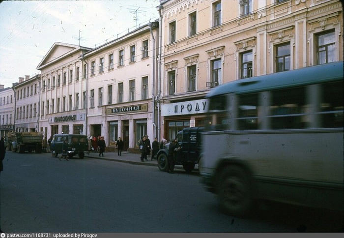 Ещё один участок Пятницкой улице, ближе к Водоотводному каналу. Как видите, к 1968 году, трамвайные пути здесь уже демонтировали