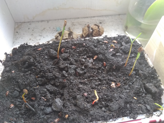 Пару недель назад вымочил остальные семена и высадил в контейнер. Как цель вырастить саженцы и раздать знакомым в качестве подарка.=) Одного себе оставлю.