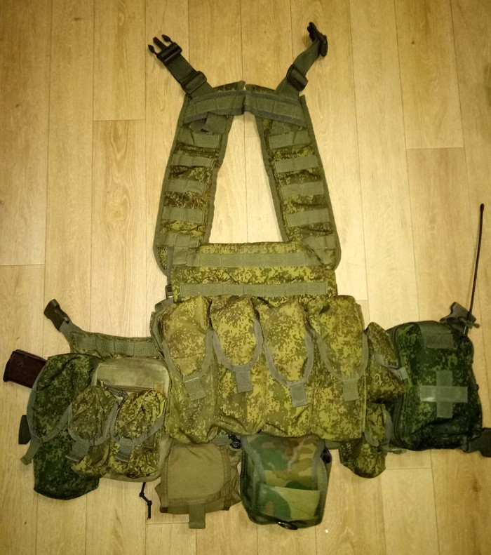Подобное наполнение подсумками позволяет разместить и переносить: 8-10 магазинов АК, 10-15 магазинов пп витязь, 4 гранаты, пистолет, аптечку, карты/документы/телефон, радиостанцию, мультитул и прочие мелочи. В варианте со спинной секцей еще + гидратор и чуть более габаритные мелочи.