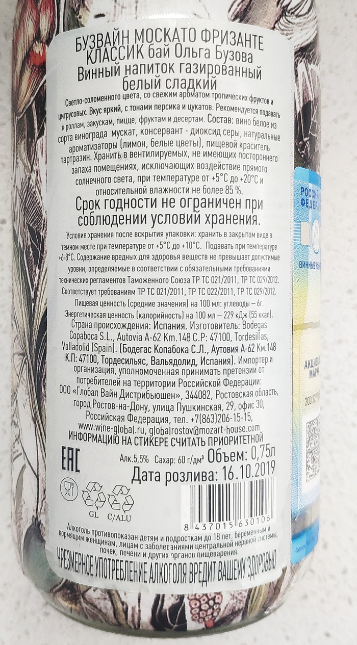 Состав: вино белое из сорта винограда мускат, консервант — диоксид серы, натуральные ароматизаторы (лимон, белые цветы), пищевой краситель тартразин.