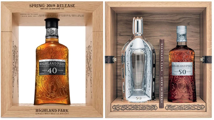 Highland Park 40 Years Old. Яркого медного цвета с ароматом сушёных фруктов, пряностей и шоколада. Послевкусие мягкое, длительное, с нотами вереска и дыма. Крепость 43,2%. £ 3000.