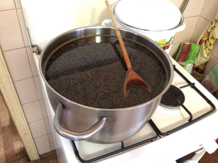 Возьмем 10 литровую кастрюлю туда 4 литра воды и чуть подогреем, чтоб растворялось лучше и выливаем туда 7 наших банок, споласкиваем банки и туда же в кастрюльку. Добавляем 1 кг сахара (для адептов декстрозы) и все перемешиваем до растворения.