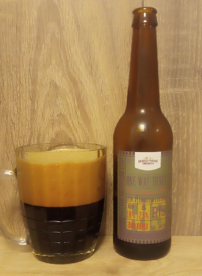 Темная, темная жидкость, с очень темной пеной. По описанию : One Way Ticket сложный, крепкий сорт сочетает в себе приятные ноты виски и чернослива в аромате, мягкую текстуру и спиртуозное послевкусие. С первого глотка ничего не почувствовал, а вот во втором отчетливо прорисовался виски. Весьма интересный вкус, очень крепко, как во вкусе так и по содержанию алкоголя. Но после выпитой бутылки, лишь немного захмелел, это хорошо. Приятно согревает как хороший глоток добротного виски. Однозначно понравится любителям крепких напитков и стаутов.