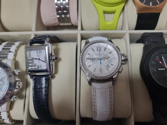 Внутри стоит автоматический механизм (который не нужно подзаводить, он работает от движения руки). Три диска - для секунд, минут и часов. В середине - показатель минут, слева - часов, с правой стороны - деление секунд.