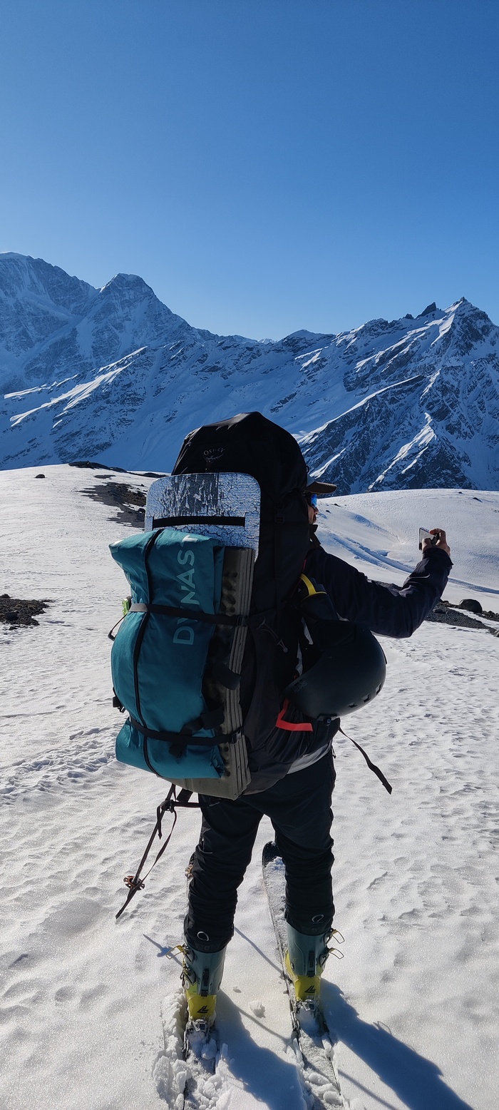 У взлета на приют 11 попили чаю и поговорили с инструктором базы МО Дмитрием. Он там просто налегке скитурил. Дошли до места стоянки у левой стелы. Снега нет и стенки каменные от ветра. Поставились и пошли прогуляться до 4600м , взлета на скалы Пастухова. Обратно уже спустились на лыжах. Первые покатушки в сезоне.