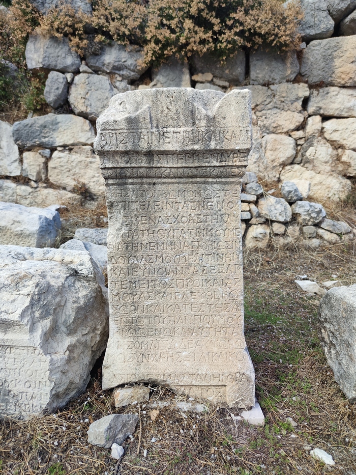 Месяц назад довелось провести неделю на побережье Средиземного моря в Кемере. Как любитель активного отдыха, в обязательном порядке арендую машину, чтобы иметь возможность уйти с туристического маршрута и взглянуть на страну с другой стороны. В этот раз решил повторно посетить руины древнего полиса Ариканда, что расположен в 60 км к северу от Финике. Расскажу о нем немного в конце, сейчас же переду к сути. Многие древнегреческие города изобилуют надписями и текстами. В этом городе археологи сложили несколько каменных оснований и обломков с текстами на парковке рабочего персонала. Меня заинтересовал один из них, как мне показалось сначала, постамент памятника с текстом на всю грань.