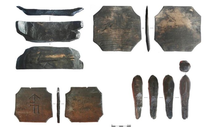 Российские археологи нашли в Великом Новгороде сосновую палочку в виде игрушечного деревянного меча размером с ладонь. На лезвии которого вырезаны восемь рун датским вариантом рунического алфавита.
