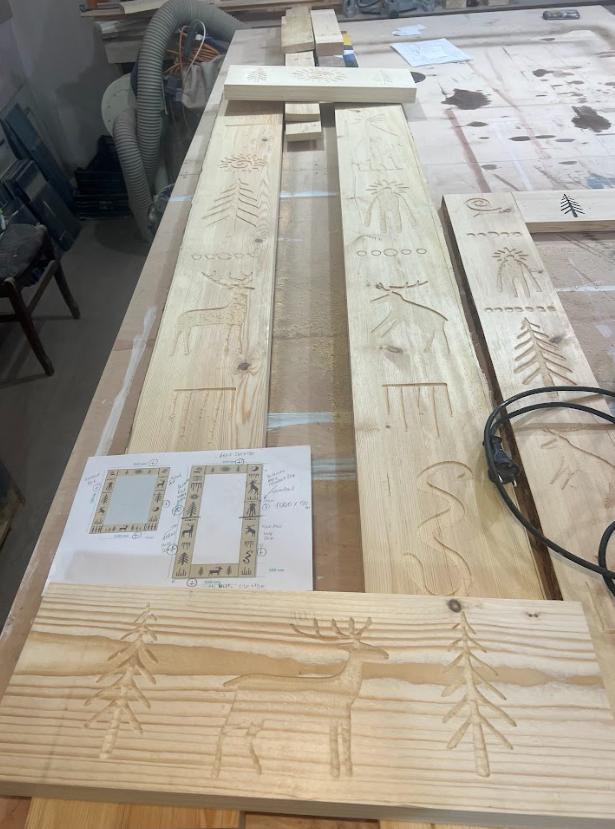 Как только эскиз был утверждён, мы начали переводить его в цифру. Тут на помощь приходит ЧПУ-фрезер — он позволяет сделать вырезы с ювелирной точностью. Всё, от мелких линий до рельефных фигур, вырезается с идеальной геометрией.