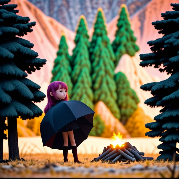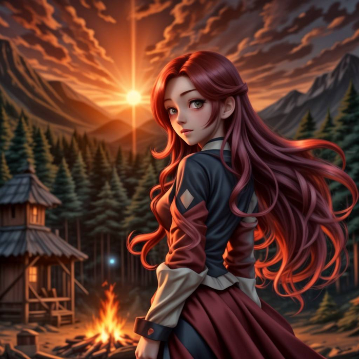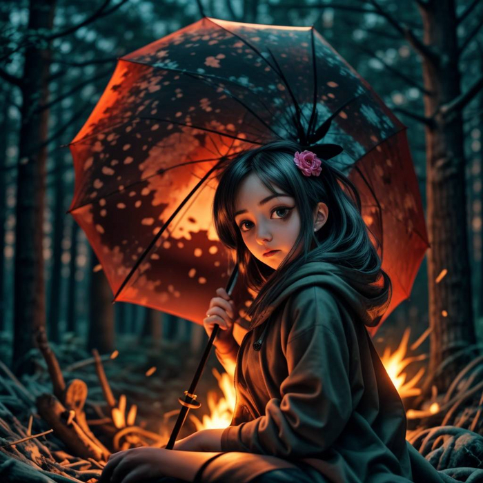 "Красивая девушка с длинными красными волосами защищается зонтиком от костра в лесу".
