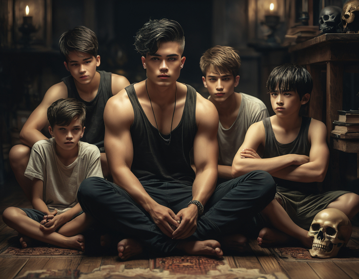 (Masterpiece, High Resolution, Digital Art:1.2), (Illustration by Charlie Bowater:1.3), a shirtless man with black hair, [exuding a sense of strength and masculinity:1.1], sitting in a focused pose, [conveying determination and concentration:1.1], surrounded by multiple boys wearing shorts and barefoot, [representing a sense of camaraderie and friendship:1.1], indoors in a dimly lit room, [creating a mysterious and intimate atmosphere:1.1], emphasizing two boys, glowing with an ethereal light, [adding a touch of magic and intrigue:1.1], the man wearing a tank top and the boys wearing t-shirts, [highlighting their casual and relaxed style:1.1], a box with a skull symbol resting nearby, [adding an element of mystery and darkness:1.1], a computer in the background, [indicating a modern setting:1.1], and the man being bald, [emphasizing his unique appearance and adding a sense of intrigue:1.1].