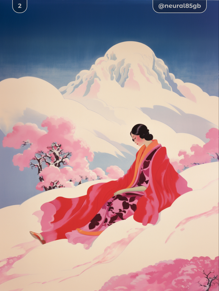 Промпт для 1 и 2: de luxe vogue january 1920, in the style of colorful animation stills, snow scenes, maroon and magenta, traditional chinese, tempera, dansaekhwa, gesture