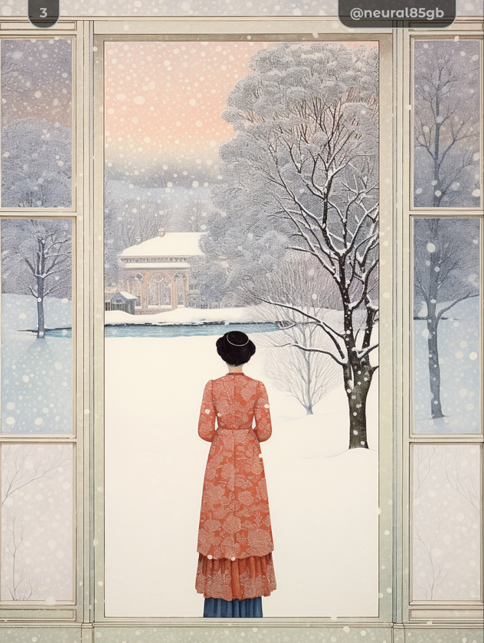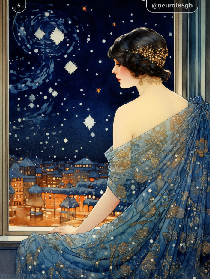 Промпт для 5 и 6: the woman is looking out the window looking at the snow falling, in the style of art deco sensibilities, maximalism, nicholas hilliard, louis rhead, pictorial fabrics, richard e. miller, gemstone