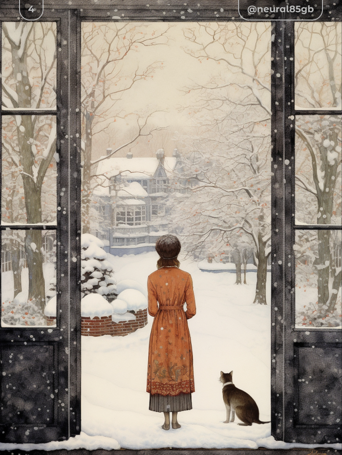 Промпт для 3 и 4: a woman stands by a window looking out, in the style of coles phillips, jane crowther, snow scenes, toyen, hand-coloring, mono-ha, use of precious materials