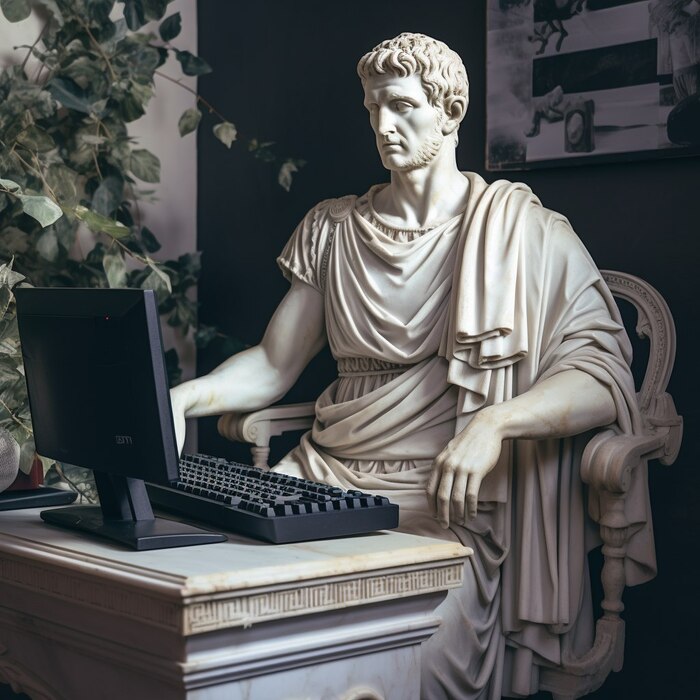 julius caesar in front of an 80s computer, vintage computer, roman emperor clothing, typing, in the style of marble statues, white marble statue