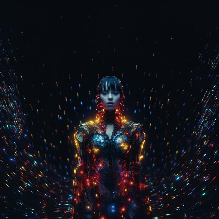 Billie Eilish as a cyber punk neon android in a colorful led sequin body suit in the style of Alex Garland. Photorealistic. Reality. Focused. Clean sharp focus. No blur. Crystal clear. Hyperdetailed. High resolution. UHD. 8K. Ultra High Definition. High Quality.