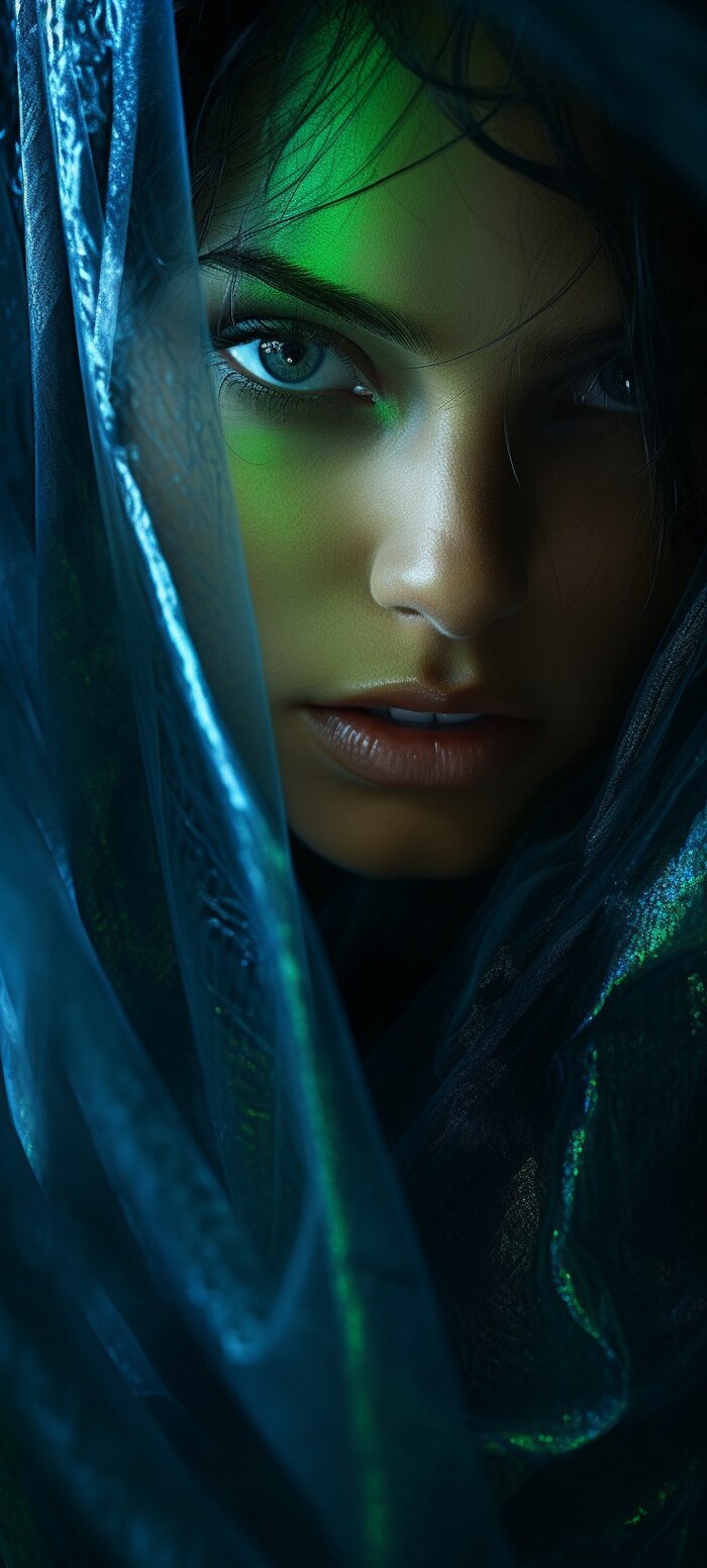 a woman behind a mysterious translucent veil with green cat-like eyes, shiny blue-black hair, mesmerizing photo, dynamic composition and dramatic lighting, dark fashion and darkcore, highly detailed and intricate, wet, metal, shiny, cobalt blue, cyan, neon toxic green, black --ar 9:20 --c 17 --s 150