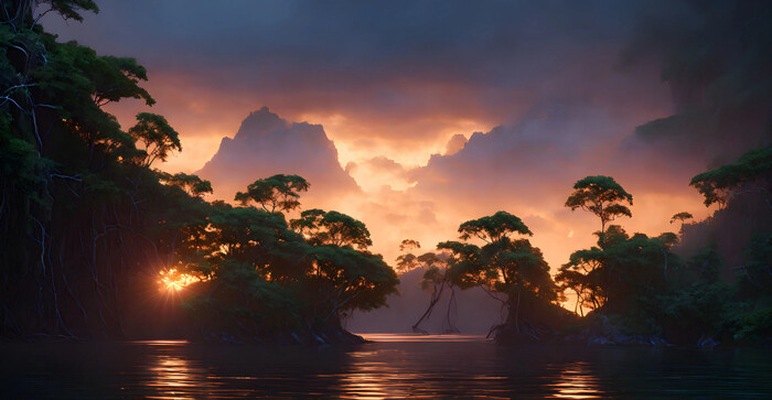 Prompt: fine-art oil painting of a rain forest, hyper-detailed defined acrylic painting, vibrant colors, 8K resolution, polished divine photorealistic intricate complex HDR, amber glow, dreamy, golden ratio composition