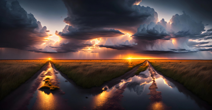 Prompt: Cumulonimbus clouds, plains, grasslands, road with puddles, reflection, sunset