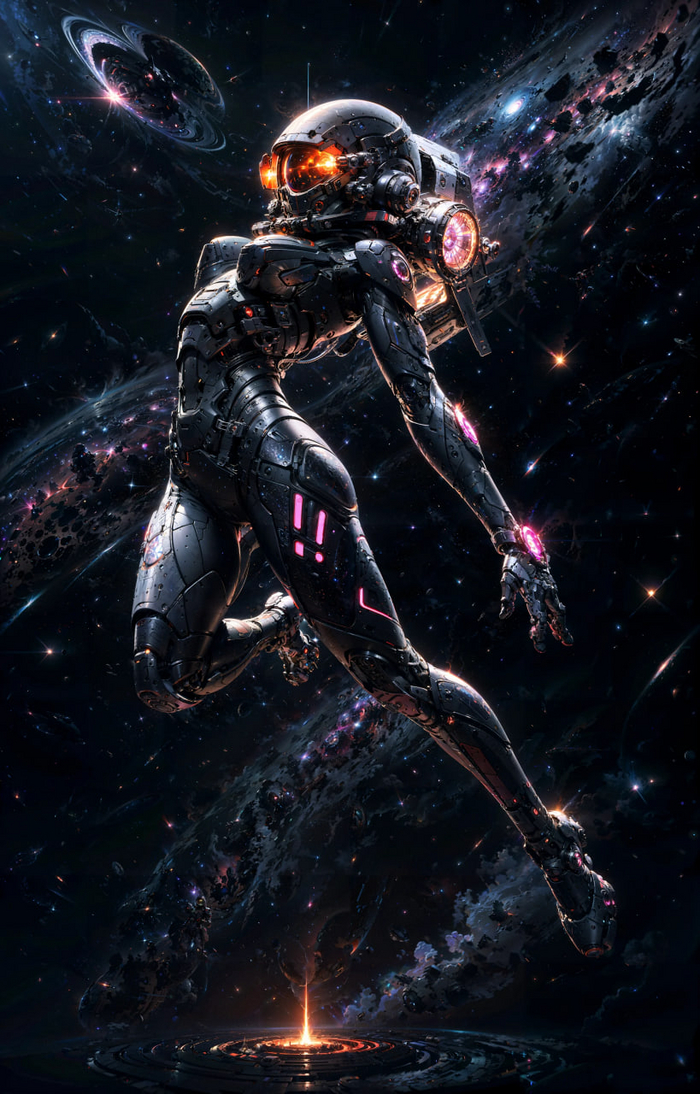 Prompt: 1girl, solo, tech, mecha, astronaut, space suit, dark background, reflective surface environment, space sky, galaxies, <lora:MG_jixie:0.3>, <lora:mechaarmor_v0.7:0.65>, (hologram floating in space, neon, light projections, galaxies, deep space:1.3), a vibrant digital illustration, dribbble, (quantum wavetracing:1.2), black background, behance hd, (glow effects:1.1), godrays, [symmetrical composition::0.5], Hand drawn, render, 8k, octane render, cinema 4d, blender, dark, atmospheric 4k ultra detailed, cinematic, Sharp focus, big depth of field, Masterpiece, colors, 3d octane render, 4k, concept art, trending on artstation, hyperrealistic, Vivid colors, extremely detailed CG unity 8k wallpaper, trending on CGSociety, Intricate, High Detail, dramatic