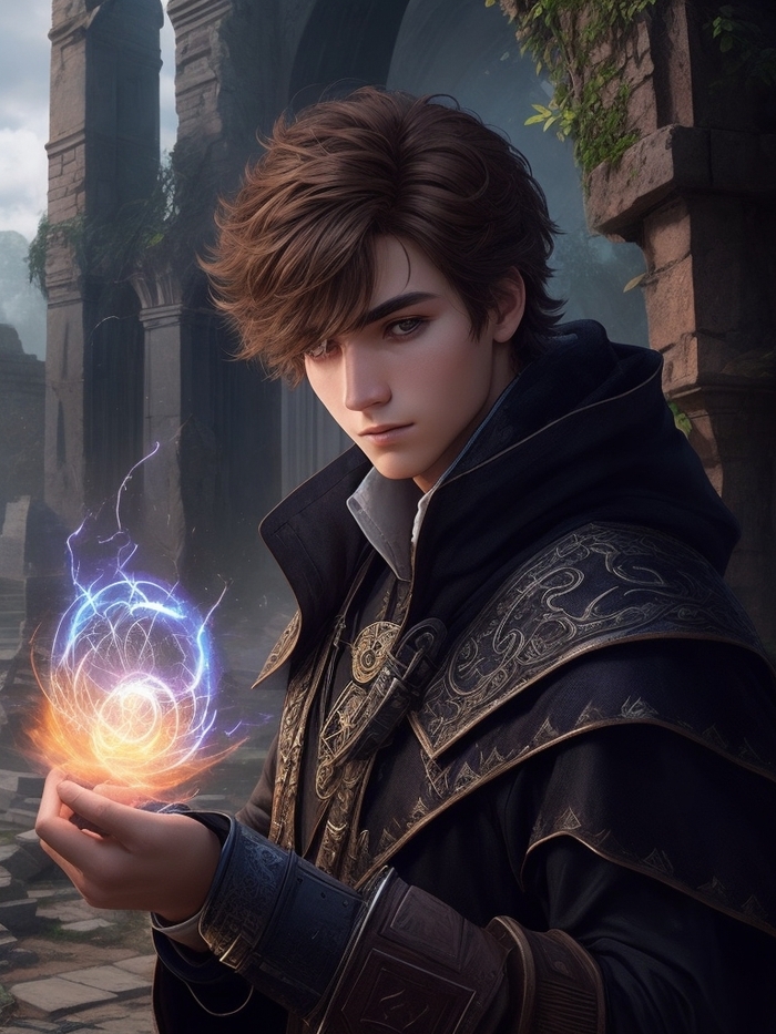 Prompt details: 1brutal young man, techno mage, rock mage, detailed face, brown hairs, in action, casting a spell, old ruins, ultra details.