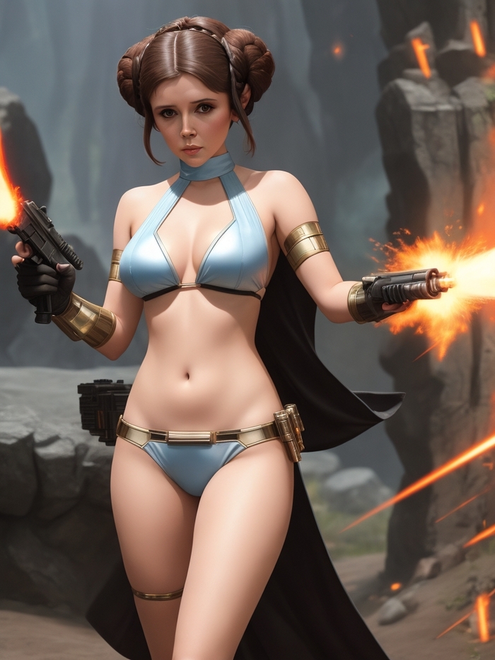 Prompt details: Princess Leia, fantasy, bikini armor, with blaster, in action, attacking, ultra details.
