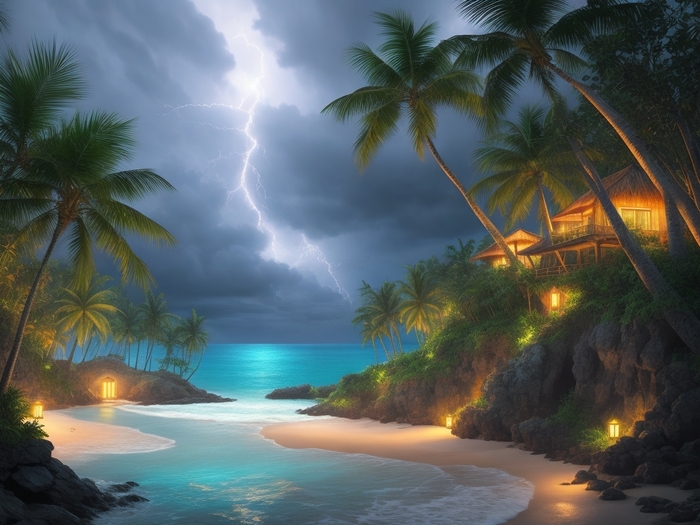 Prompt details: Beautiful fantasy seashore, nice and cozy nature, storm wind and rain, palms and coconuts, thunder and lighting, ultra details.