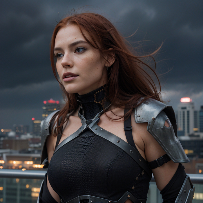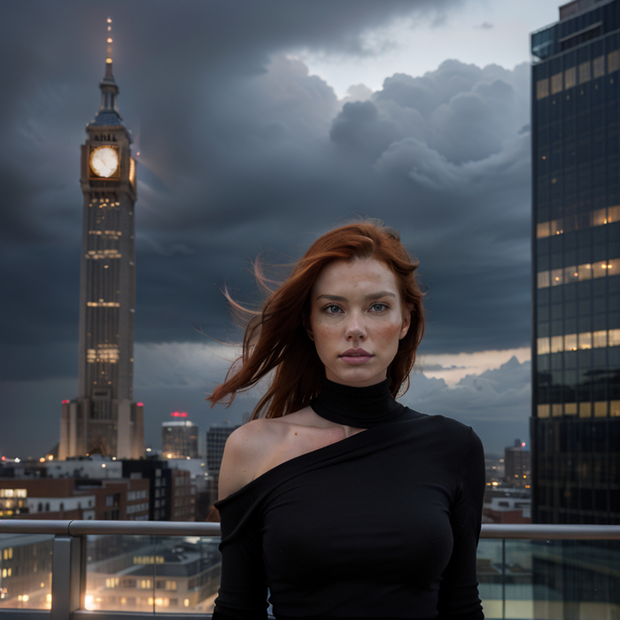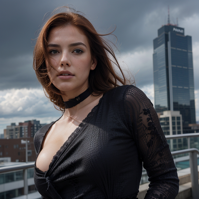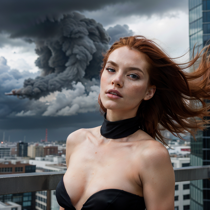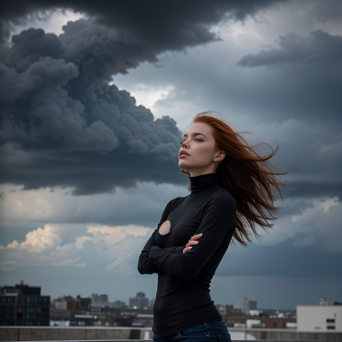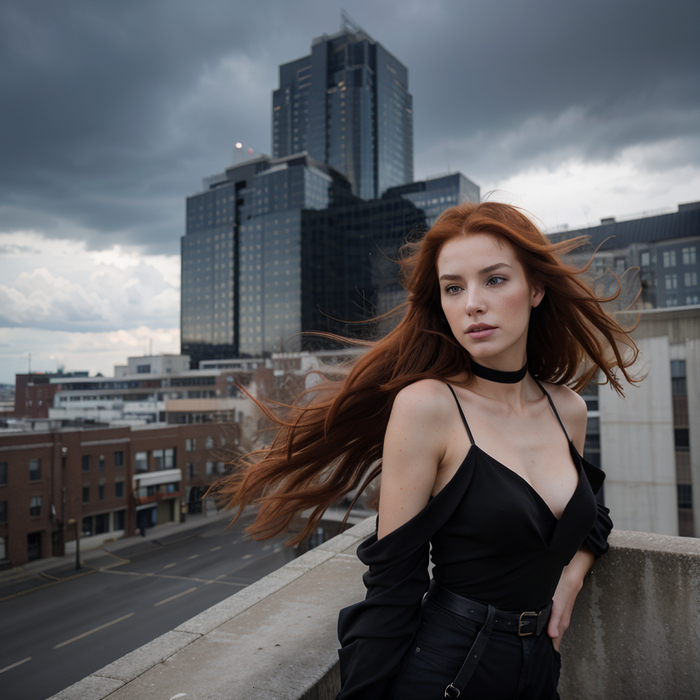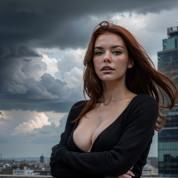 full body photo, (action-paked:1.4), (emotions:1.2), beautiful girl, redhead, neckline, natural skin textures, (paul zazke:1.3), the roof of a tall building, the wind blows her hair, the dark sky before the rain, thunderclouds, (masterpiece:1.2) (photorealistic:1.2) (bokeh:1.2) (best quality) (color grading) (detailed skin:1.3) (intricate) (8k) (HDR) (cinematic lighting:1.3) (sharp focus) (Clutter-Home:1.2)