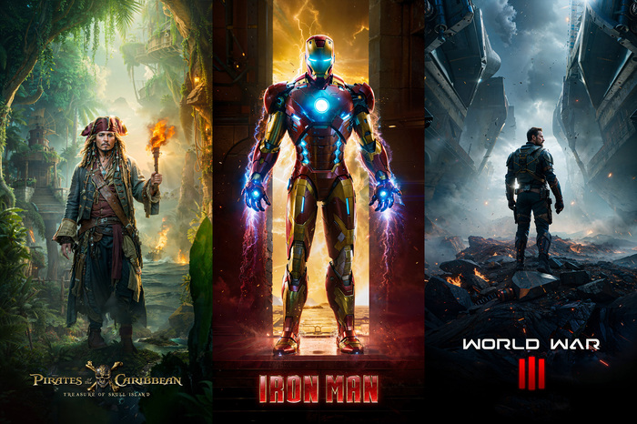 Чтобы сделать эти плакаты, автор сначала использовал Midjourney, он генерировал изображения, пока не получил то, что ему подходило. Например промпт для первой картинки был New pirate of the caribbean movie poster, 2025, dramatic, epic, 32k UHD, cinematic lighting, fully detailed, colorful --v 5 --ar 5:10 --q 2