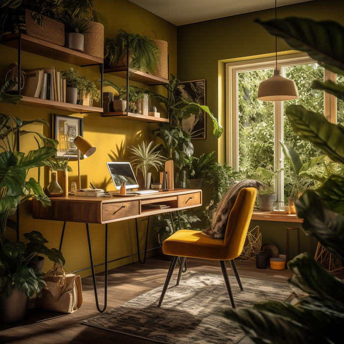 perfect design of a cozy home office in urban jungle style, bright summer colors, morning light, professional color grading. Soft shadows. Clean sharp focus. High-end retouching. Design magazine photography. Award winning photography. Advertising photography. Commercial photography, 4k